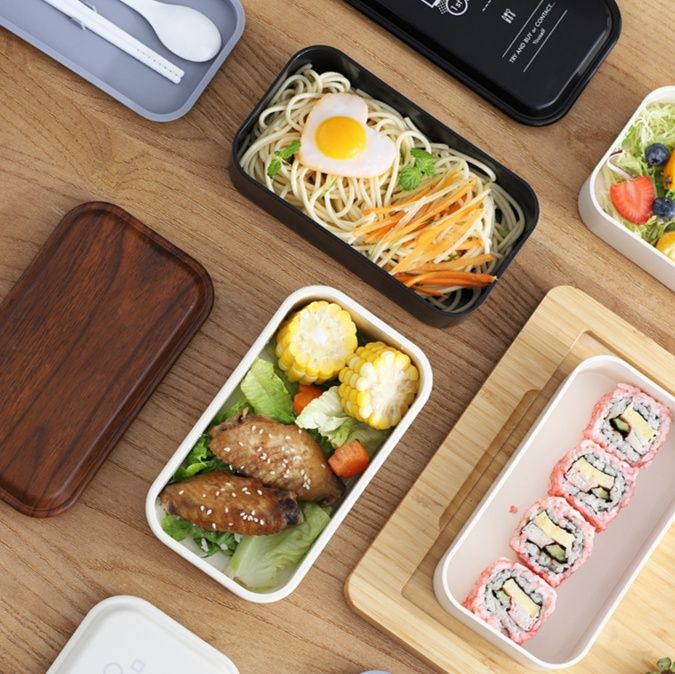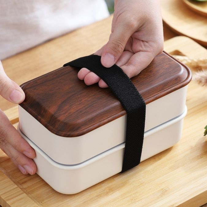 弁当箱本体は角丸の長方形で、持ち運びしやすいスリムな設計になっています。固定用のゴムバンドが付属しており、通勤通学時もしっかり密閉できます。