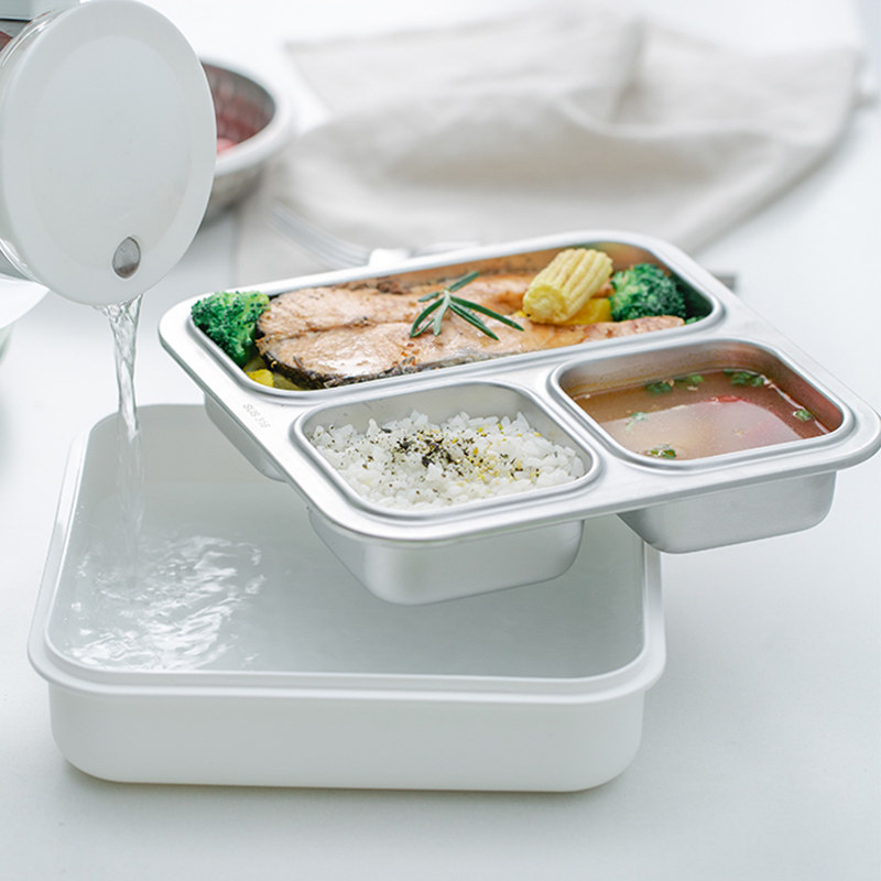 三つの仕切りで主菜、副菜、ご飯をきれいに分けられる保温弁当箱です。 透明な蓋で中身が一目で確認でき、ステンレス製の保温容器が温かさをしっかりキープします。 密閉性の高い留め具で汁漏れを防ぎ、持ち運びも安心です。 ランチタイムに温かい食事を楽しめる弁当箱として、毎日のお弁当作りをサポートします。 容量たっぷりで栄養バランスの良い食事を詰められる実用的な一品です。