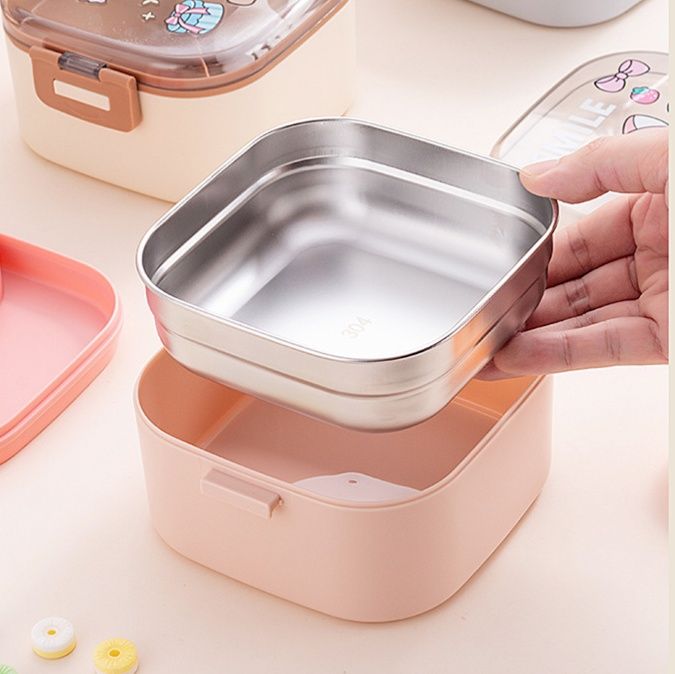 ランチタイムが楽しくなる可愛いイラストが描かれた二段弁当箱です。 透明な蓋で中身が一目で分かり、両側に付いた取っ手で持ち運びも便利です。 上段と下段で主食とおかずを分けて詰められるので、汁漏れの心配もありません。 付属のカトラリーや仕切り付きで、毎日のお弁当作りがより快適になります。 通勤通学はもちろん、行楽やピクニックにも最適な弁当箱です。