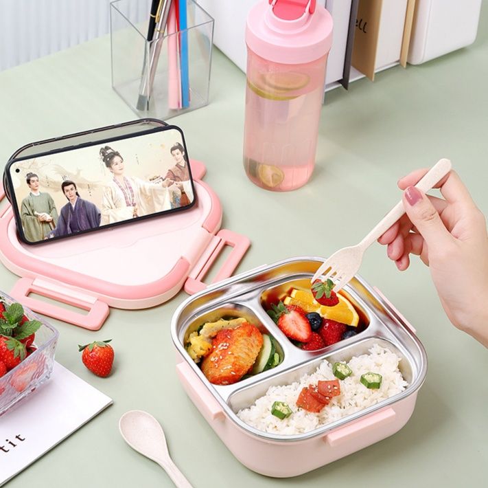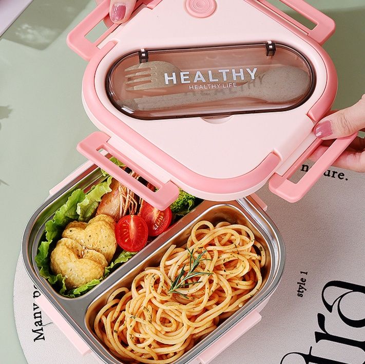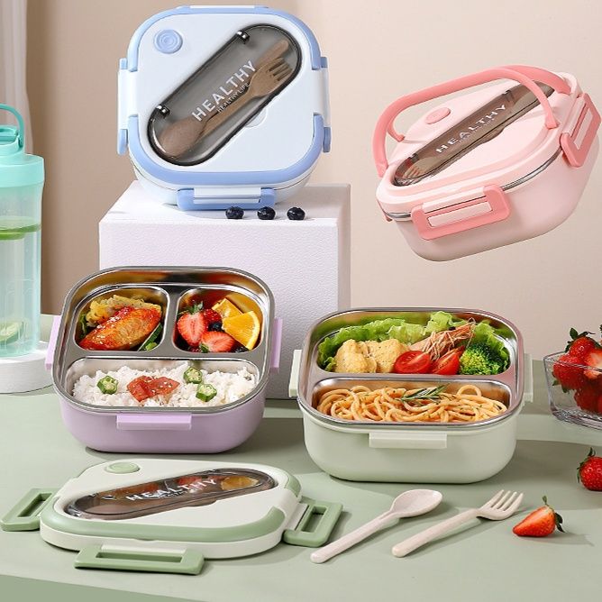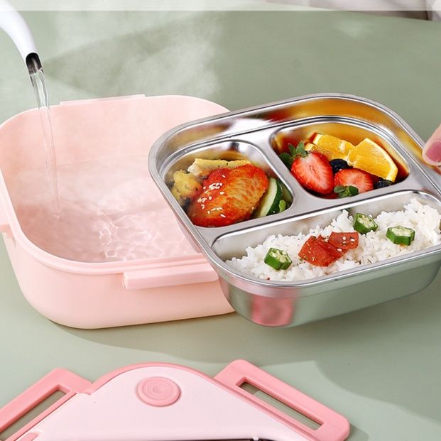 三つに仕切られた内容器はステンレス製で、ご飯とおかずをバランスよく詰められます。