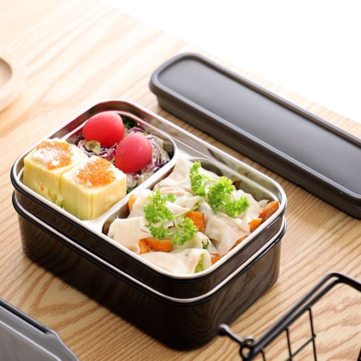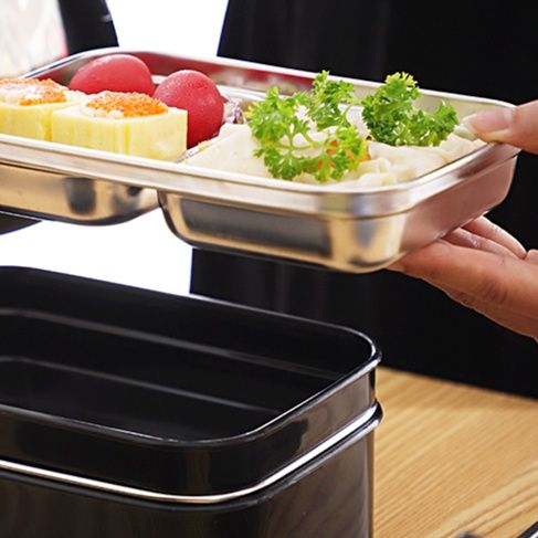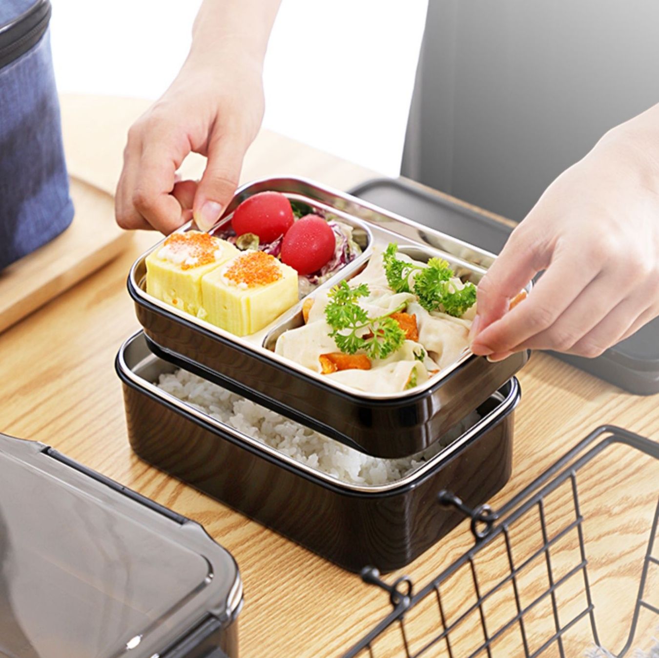 上段はステンレス製の仕切り付き容器で、おかずを美しく盛り付けられます。下段は主食用として十分な容量を確保しています。